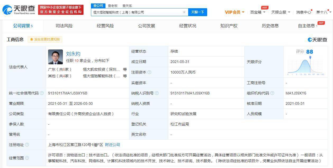 5 月 31 日,恒大恒馳智能科技(上海)有限公司成立,注冊資本 1 億人民幣,法定代表人為劉永灼,經營范圍包括從事智能科技、汽車科技、網絡科技、計算機科技領域內的技術開發、技術轉讓、技術咨詢、技術服務等。股權穿透圖顯示,該公司由恒大新能源汽車投資控股集團有限公司間接 100% 持股。