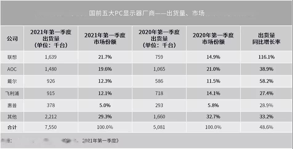 IDC 中國最新發布的《IDC 中國 PC 顯示器追蹤報告, 2021 年第一季度》顯示,2021 年第一季度中國 PC 顯示器市場整體出貨量 755 萬臺,同比大幅增長 48.6%。
