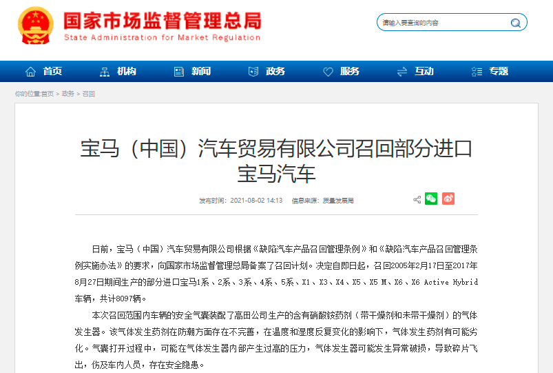 裝配「高田」安全氣囊,存在安全隱患,超 8000 輛進口寶馬被召回
