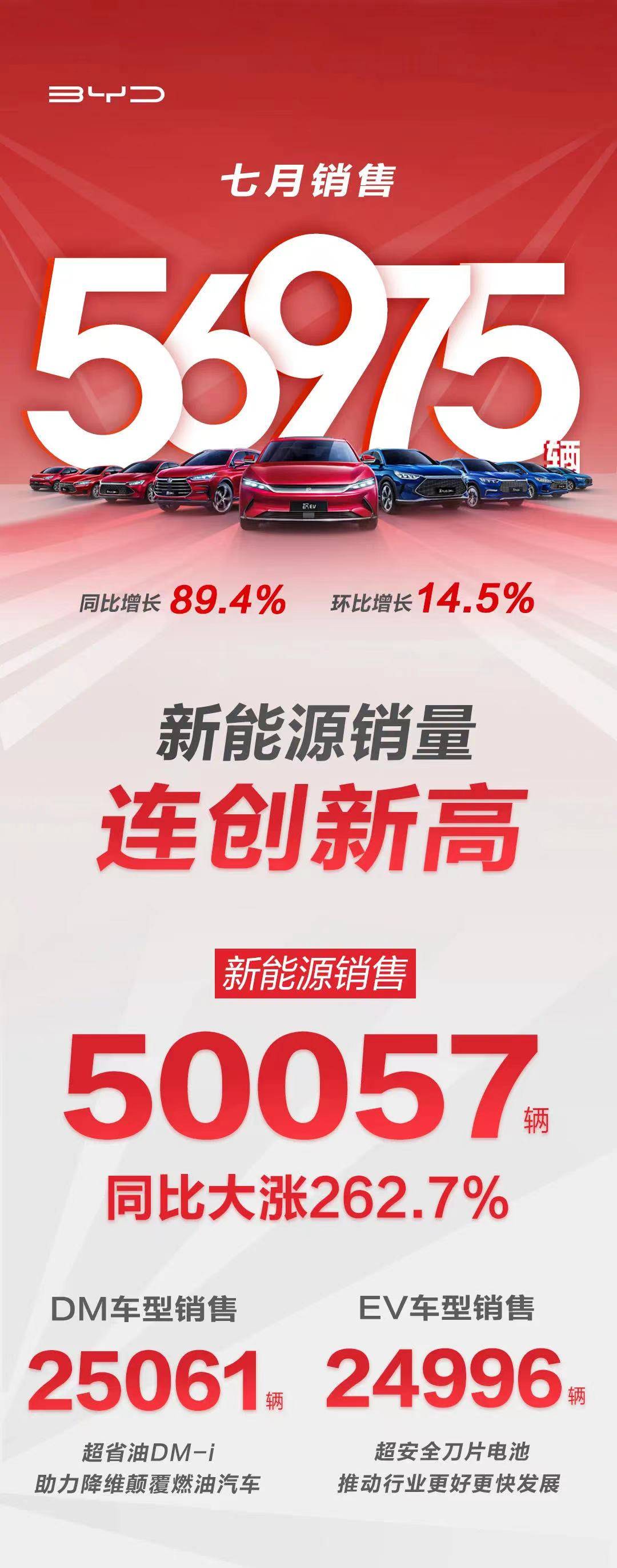比亞迪新能源車型單月銷量首次突破 5 萬輛,全系車型 7 月銷量同比增長 89.4