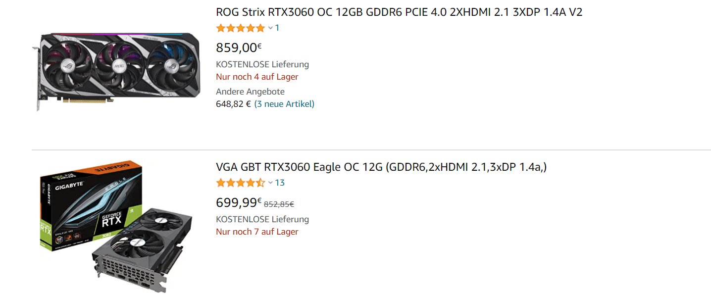 相對于國內已經降到接近原價的顯卡,國外主要電商平臺的顯卡價格降幅顯然更低,以RTX 3060為例,這款顯卡在國內一度降到了3000元以下,而在國外市場的價格則依然維持在699歐元(約合人民幣5500元)左右,相同的價格已經能夠在國內買到RTX 3070Ti。