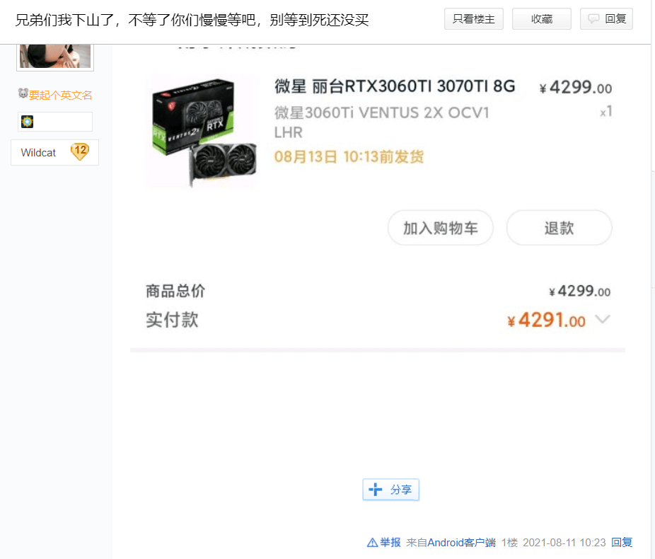 顯卡價格的暴跌,DIY愛好者和玩家們自然是拍手稱好,一部分早已按捺不住的網友甚至已經直接下單購買,畢竟相比起過去幾個月的兩倍溢價,現在僅10%-20%的溢價并不高,對于剛需玩家來說已經是可以入手的價格。