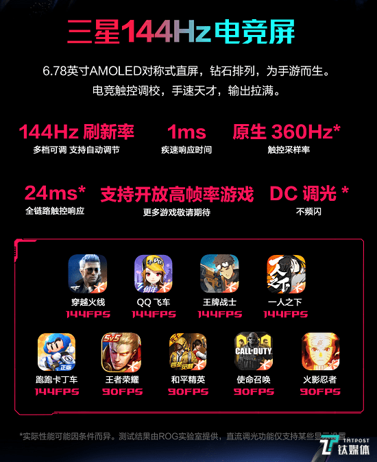 屏幕方面,騰訊ROG游戲手機5S全系標配三星AMOLED 電競屏,擁有144Hz刷新率與1ms響應時間,最高每秒可顯示144幅畫面,同時支持360Hz的原生觸控采樣率。