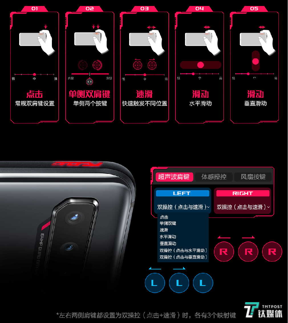 不只是性能與畫面,操控增益對于普通玩家來說是重大福利。騰訊ROG游戲手機5s升級了AirTrigger超聲波2×3肩鍵,點擊+速滑 ,單側可以實現3個點擊映射,更多的操控可能可以讓玩家更加自由的自定義適合的鍵位在戰斗身法和視野調整上更加靈活。