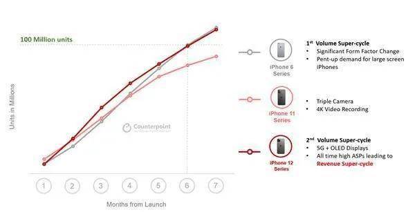 數(shù)據(jù)顯示,去年第四季度iPhone 12的銷量甚至破了蘋果近五年的紀錄。而Counterpoint Research的報告數(shù)據(jù)顯示,iPhone12系列上市7個月,銷量就突破1億臺大關。這也幫助蘋果在去年第四季度擊敗三星,成為全球智能手機銷量第一。