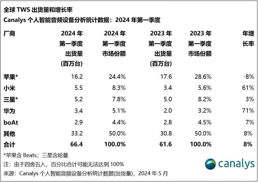 根據(jù)Canalys的數(shù)據(jù),2024年第一季度,全球個人智能音頻設備市場呈回暖的跡象,同比增長6%,出貨量超9000萬臺。此次增長,主要得益于真無線藍牙耳機(TWS)和無線頭戴式耳機的強勁表現(xiàn),兩者的出貨量分別增長8%和12%。