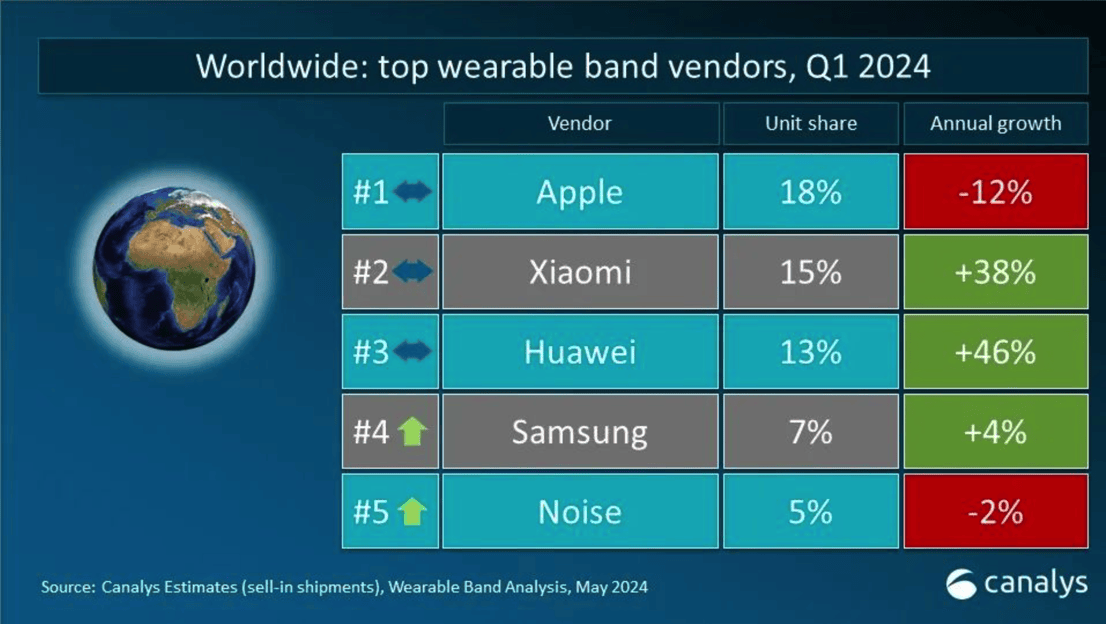 2024年第一季度,全球可穿戴腕帶設備的出貨量達4120萬臺,與去年同期基本持平。基礎手表功能豐富,價格實惠促進出貨量的增長,基本彌補基礎手環(huán)和智能手表帶來的整體出貨下跌。