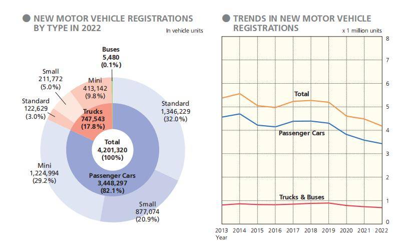 根據日本汽車工業協會公布的數據,2019年,日本汽車銷量達到519.52萬輛,同比下降1.5%;2020年銷量為459萬輛,同比下降11.5%;2021年銷量444萬輛,同比下降3.3%;2022年銷量為420萬輛,同比下降5.4%。