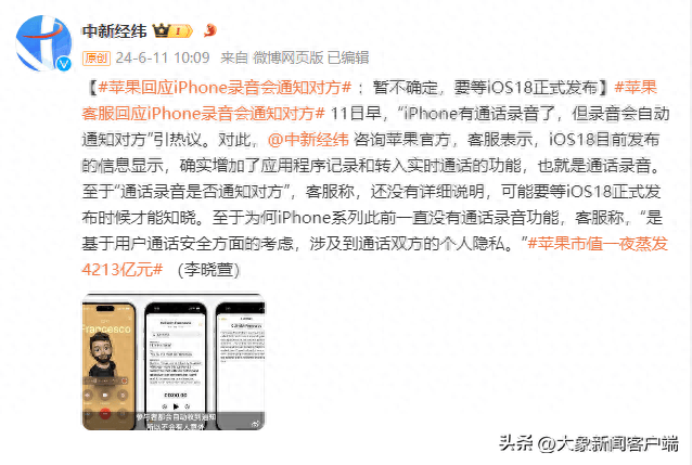 原標題:iPhone錄音會通知對方?蘋果回應 待iOS18正式發布時候才能知曉