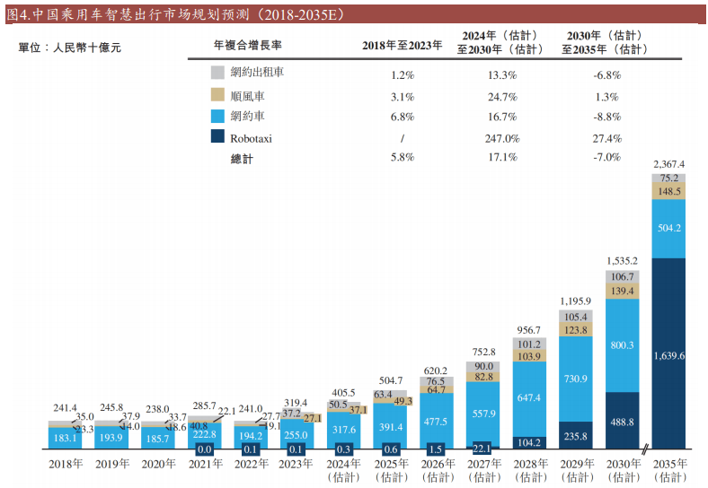 另一方面,更加智能、舒適且實惠的乘車體驗,會促使用戶的通勤選擇進一步向Robotaxi傾斜。根據“自動駕駛運營第一股”如祺出行的招股書數據,Robotaxi在出行市場中所占的比重會逐年增加。預計 2030 年 Robotaxi 在中國智慧出行的滲透率將達到 31.8%,2035 年將達到 69.3%,有望超過網約車、順風車等其他出行方式。