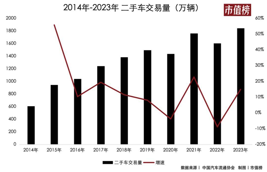 從二手車交易量看,只有2020年和2022年兩個特殊的年份的交易下滑,其他時間均處于10%左右及以上的增長階段,2023年二手車交易1841萬輛,同比增長15%,同期新車銷售量為3009.4萬輛,二者銷量差距正在快速縮小。