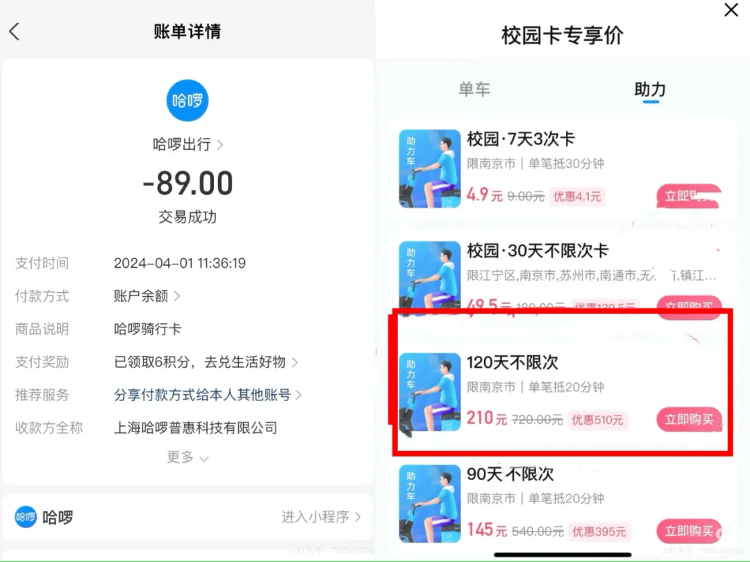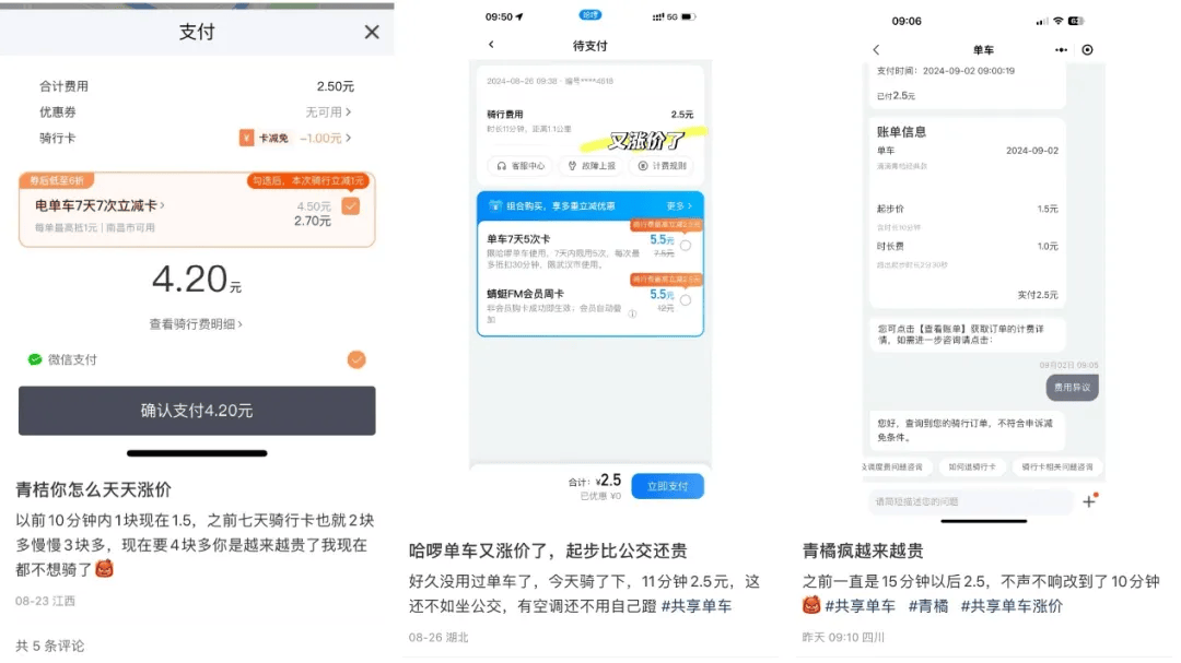 除了單次騎行的收費(fèi)標(biāo)準(zhǔn)發(fā)生了變化,月卡、周卡和學(xué)期卡等各種騎行卡的費(fèi)用也有所變化。其中,有網(wǎng)友提到,青桔電單車地7天7次騎行卡之前價(jià)格在2-3元,但最近漲至4元左右。另一位網(wǎng)友則提到南京市的哈啰助力車校園卡也漲價(jià)了,“上學(xué)期買的學(xué)期卡89元,這個(gè)學(xué)期快開學(xué)了點(diǎn)進(jìn)去一看,120天要210元?請(qǐng)問哈啰你這個(gè)價(jià)格的意義是什么?為了多騙點(diǎn)大學(xué)生的錢嗎?”