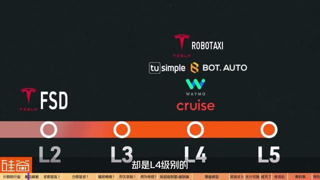 我們之后提到的Waymo和Cruise,以及侯曉迪做的無人卡車都屬于L4級別,特斯拉FSD屬于L2級別,但馬斯克號稱的特斯拉Robotaxi,卻是L4級別的。