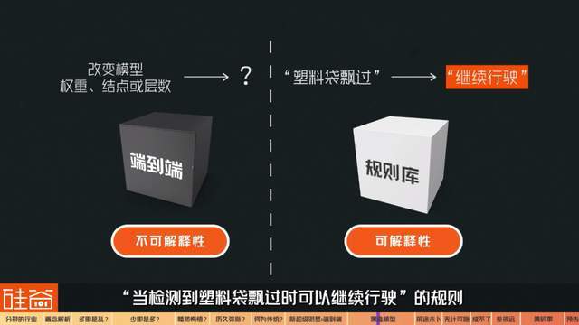 與之相對的,是可解釋性,比如在Rule-based的模式下,工程師已經寫入了“當檢測到塑料袋飄過時可以繼續行駛”的規則,那我們就不用擔心遇到這種情況會突然來個急剎車。