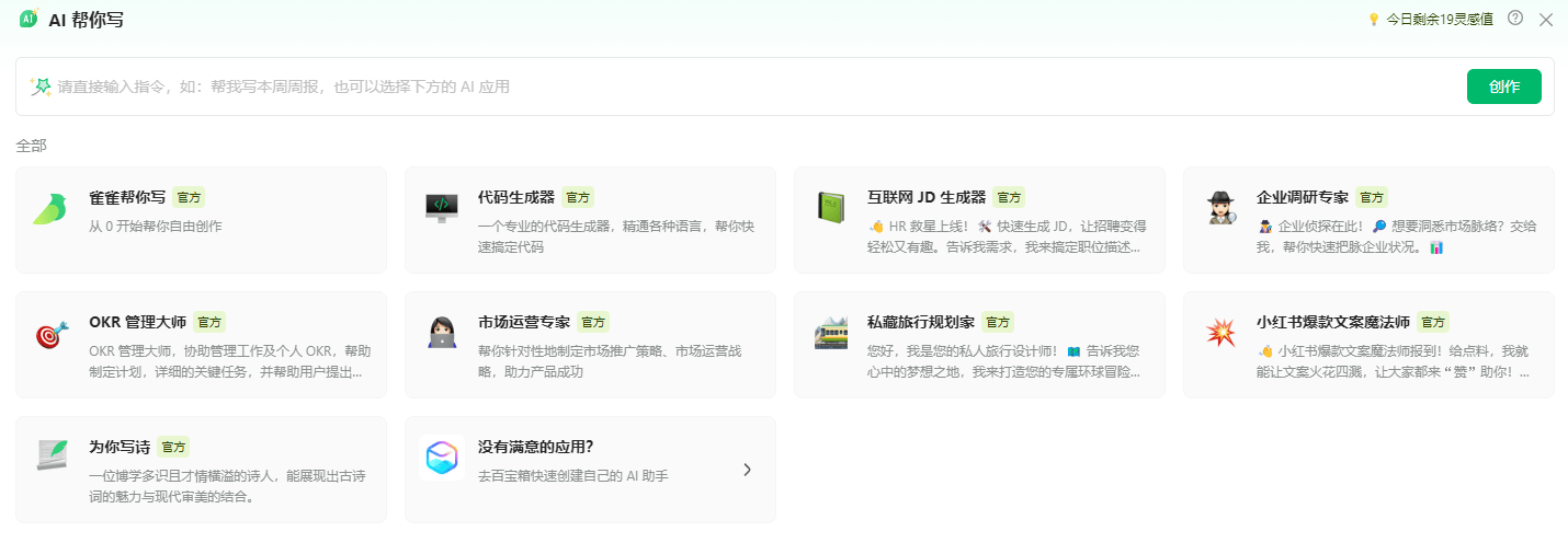 相比之下,國內的產品堆功能、縫合的現象比較明顯。比如,在語雀為數不多的功能中,就有市場運營專家、小紅書爆款文案等應用,還鼓勵用戶創建自己的AI助手。同樣的現象也存在于WPS AI以及眾多聊天模型應用中。這些應用實際只是“預制提示詞”,并非真正的“產品功能”。