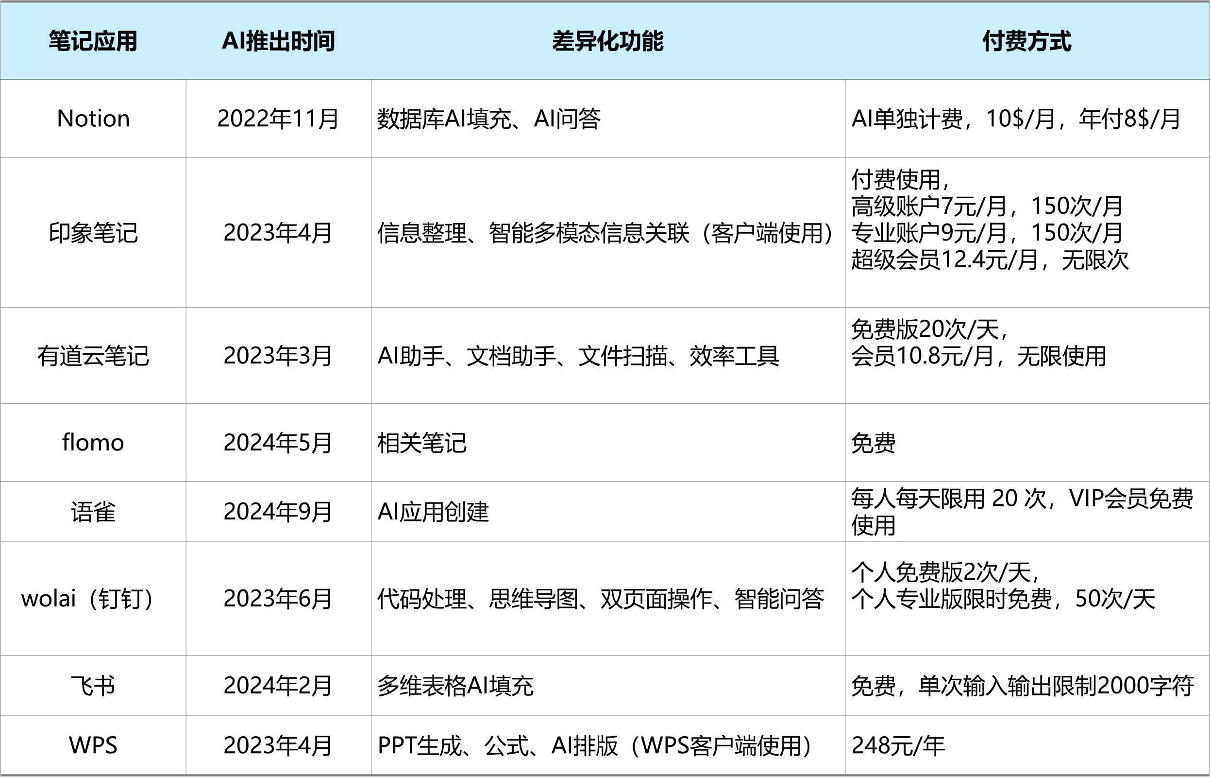 相比Notion,國內廠商在內置AI方面行動相對遲緩。直到2023年4月,印象筆記才推出“印象AI”,有道云筆記、WPS、飛書、wolai(釘釘)也在2023年4月后推出,而flomo、語雀則到今年下半年才推出。