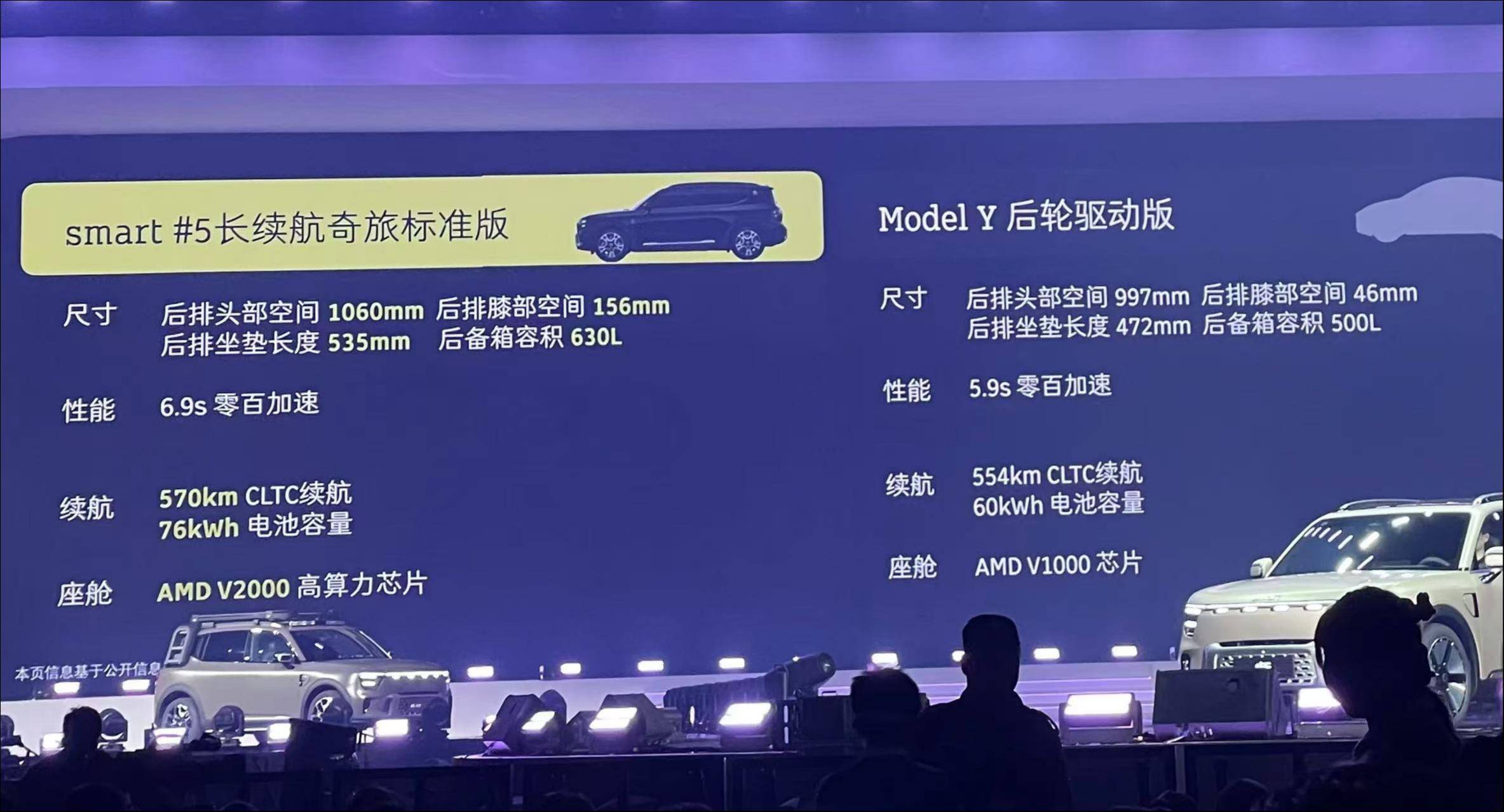 但是,令人意外的是,在發布價格環節,smart也未能免俗,佟湘北特意提到了Model Y,并且直接和smart精靈5號進行了橫向對比,更是拿長續航奇旅標準版以及長續航奇旅豪華版對比Model Y算了一筆賬,得出smart精靈5號比Model Y多出3.5萬元和5萬元的產品價值。