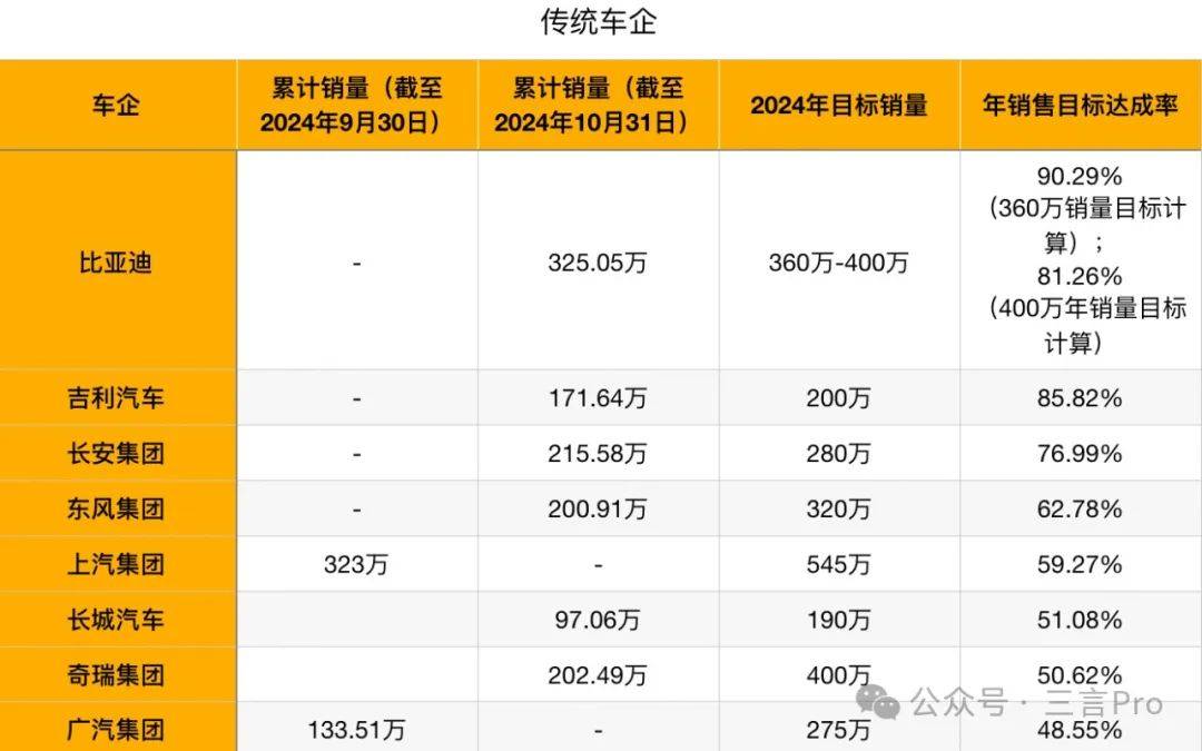 時間過的真快,2024即將結束。差不多5個月前,三言曾統計過國內各車企銷量目標完成情況,當時無論是傳統車企還是造車新勢力,年銷售目標達成率都不高。只有少數車企達成率超過四成;絕大多數車企達成率在25%上下。