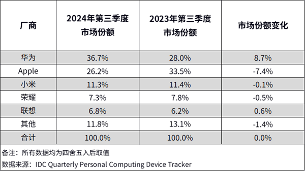 根據最新發布的IDC 2024年第三季度中國平板電腦市場季度跟蹤報告顯示,華為以顯著的市場份額優勢穩居第一,領先于蘋果。數據顯示,2024年第三季度中國平板電腦市場出貨量達到768萬臺,同比增長9.3%,連續三個季度保持出貨量正增長。