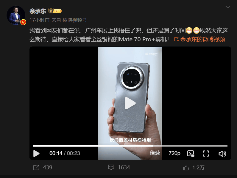 之所以聊到這個話題,主要是因為華為終端BG董事長余承東在這兩天發了個微博,不僅提前展示了即將發布的華為Mate 70 Pro+真機,更介紹該配色將命名為「金絲銀錦」,并表示“我們后蓋材質很特別”。