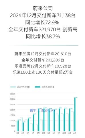 2024年全年,蔚來公司共交付新車221,970臺,同比增長38.7%。其中,蔚來品牌交付新車201,209臺,同比增長25.7%;樂道品牌交付新車20,761臺。截至目前,蔚來品牌累計交付新車650,803臺;樂道品牌累計交付新車20,761臺;蔚來公司已累計交付新車671,564臺。