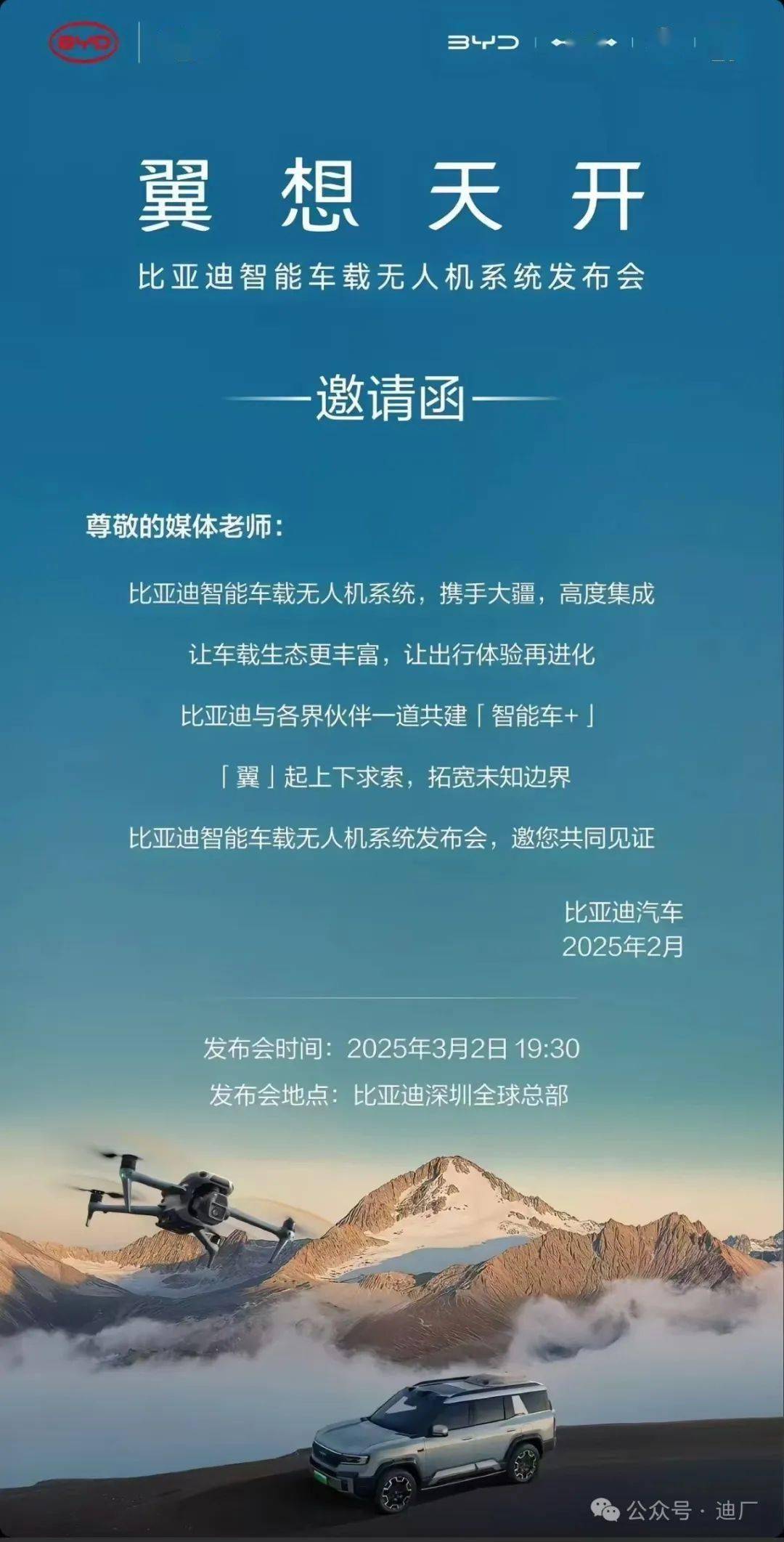 比亞迪攜手大疆,智能車載無人機(jī)系統(tǒng)發(fā)布會3月2日來襲!