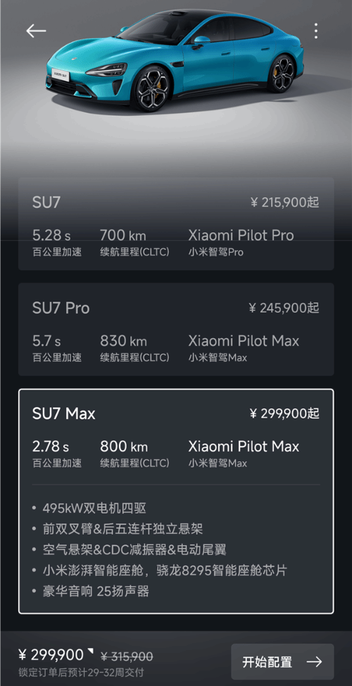 在交付時間方面,小米汽車APP顯示,目前小米SU7在鎖定訂單后預計需要36周到39周進行交付;而小米SU7 Pro的交付時間則更長一些,鎖定訂單后預計需要40周到43周。小米SU7 Max的交付時間相對較短,預計為30周到33周。這一數據表明,小米SU7 Pro的生產訂單已經排到了2026年,產能處于較為緊張的狀態。