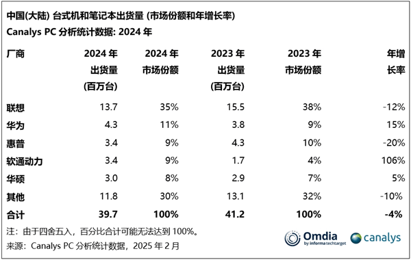 2024年中國PC市場年終盤點:聯想領跑,華為強勢躋身前三
